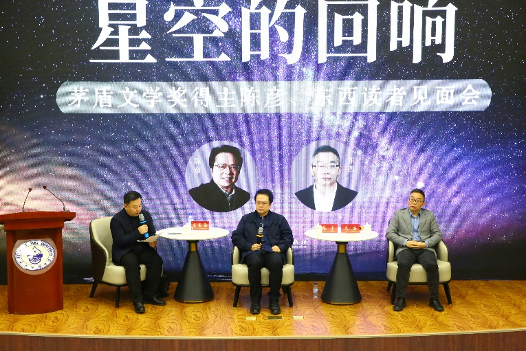 第十四屆全國政協常委、中國作家協會副主席、第十屆茅盾文學獎獲得者陳彥和第十四屆全國人大代表、廣西壯族自治區文聯主席、廣西作家協會主席、第十一屆茅盾文學獎獲得者東西以“星空下的回響”為主題,采用訪談的形式開展報告會。訪談開始前,人民文學出版社總編輯、我校文學院優秀校友李紅強首先致辭。他表示,我校文學院具有紅色文藝基因,歷史上名家輩出,有著深厚學脈和優良傳統,陳彥和東西在文壇上留下了經久不衰的作品,必將為我們帶來一場思想盛宴。隨后,王春雨和陳彥、東西兩位作家從人物身份、創作細節、文學感受等多個方面進行了訪談式交流。訪談最后,兩位作家向廣大文學創作者和同學們表達了誠摯的祝福和真切的期盼,希望大家能保持寫作習慣,堅定寫作理想,閱讀中國傳統經典作品和外國優秀名著,用腳步丈量大地,享受創作的幸福感。