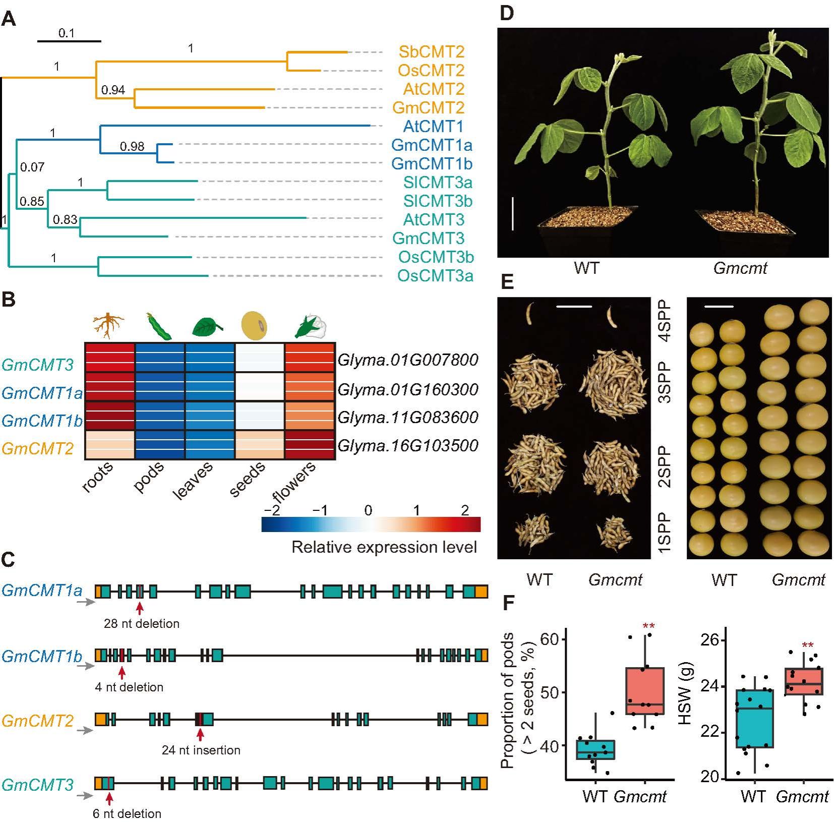 該研究通過(guò)應(yīng)用 CRISPR/Cas9 基因編輯技術(shù),創(chuàng)建一個(gè)缺失大豆中所有CMT基因功能的大豆(Glycine max)突變體系Gmcmt,這一突變體系在non-CG (CHG和CHH) DNA甲基化位點(diǎn)表現(xiàn)出明顯的低甲基化,從而增強(qiáng)了染色質(zhì)的可訪問(wèn)性,并顯著調(diào)節(jié)了包括GOLDEN-LIKE10 (GmGLK10)在內(nèi)的數(shù)百個(gè)功能相關(guān)基因的表達(dá)。這些基因的表達(dá)變化不僅提高了光合作用,而且意外地提升了根瘤菌的固定效率。此外,Gmcmt還產(chǎn)生了體積更大、蛋白質(zhì)含量更高的種子(圖2)。這些分子層面的變化最終促進(jìn)了大豆種子產(chǎn)量和質(zhì)量的雙重提升,體現(xiàn)了non-CG DNA甲基化在提高作物整體產(chǎn)量中的核心功能,展示了表觀遺傳修飾在農(nóng)業(yè)生產(chǎn)中提升大豆性狀的潛力。