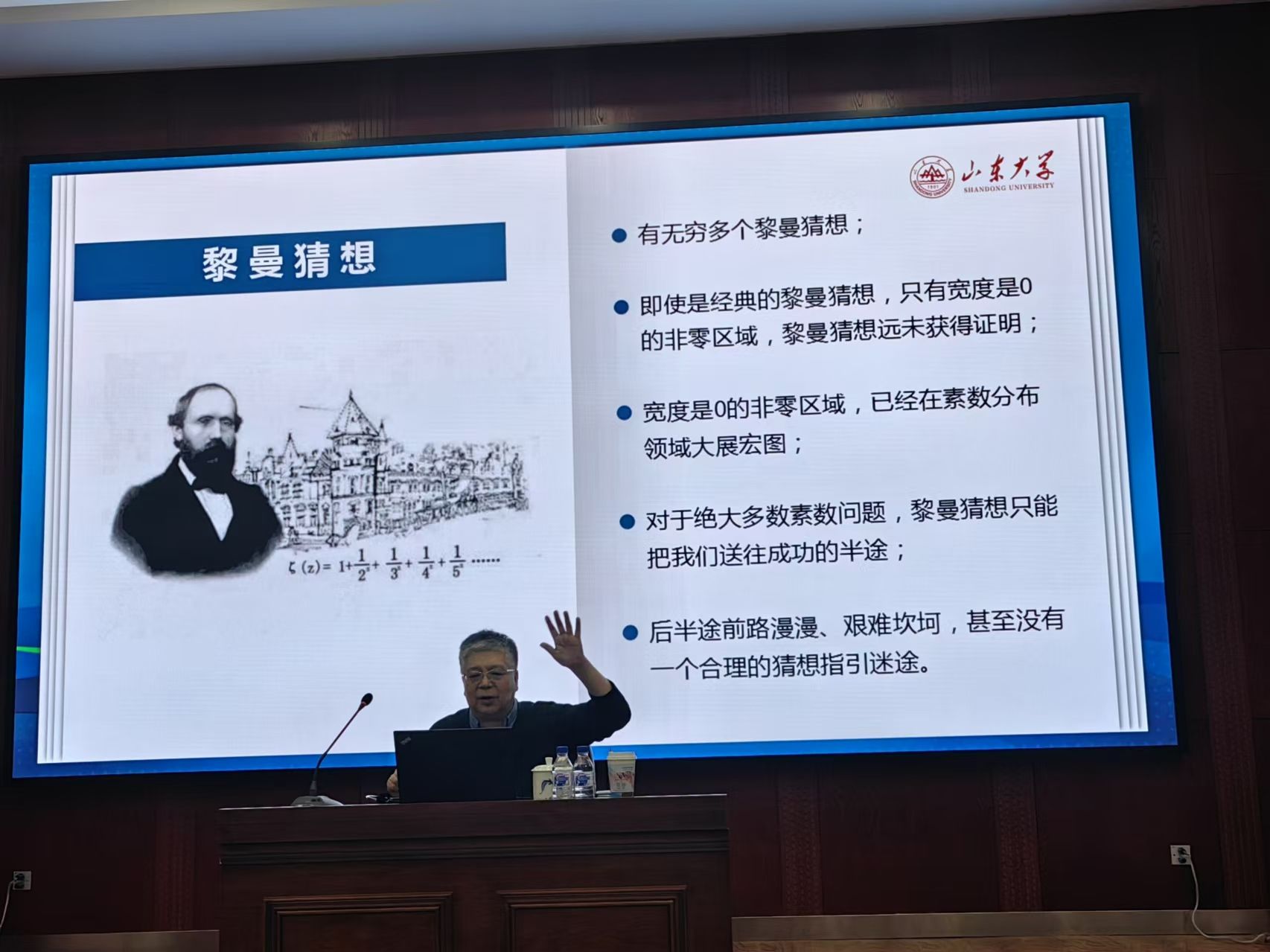劉建亞教授以通俗易懂的語言,深入淺出地介紹了數論這門古老的數學分支。數論是研究整數性質的學問,而整數可以分解為素數的乘積,因此素數分布是數論的核心問題。報告圍繞“如何研究素數分布,以及如何研究涉及素數的猜想”的主題,包括哥德巴赫猜想、Sarnak關于素數在群作用軌道上分布的綱領性猜想等,從哲學的角度介紹相關歷史、猜想、以及思想方法,著重介紹了最新進展。劉建亞教授的報告不僅展示了他深厚的學術造詣,更體現了他對數學的熱愛和對科學的探索精神。他鼓勵師生積極思考,勇于探索,不斷攀登數學高峰。