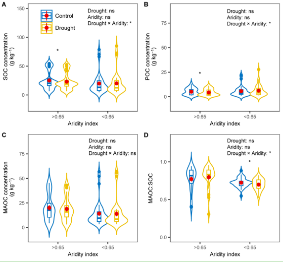 這項研究表明,在較為濕潤的地區(干旱指數大于0.65),干旱導致SOC和POC濃度分別下降了7.9%(±3.9)和15.9%(±6.2),而對MAOC濃度則沒有顯著影響。相反,在干旱地區(干旱指數小于0.65),干旱對SOC、POC和MAOC濃度均無顯著影響。研究還發現,SOC對干旱的響應隨干旱梯度的變化而變化,這與各站點年際降水變異和本底SOC濃度密切相關。這一發現有助于深入理解干旱對生態系統碳循環的影響,也為預測生態系統氣候變化響應提供了科學依據。此外,研究結果強調了干旱度指數在調控SOC響應中的關鍵作用,為制定有效的生態保護和恢復策略提供了重要參考。