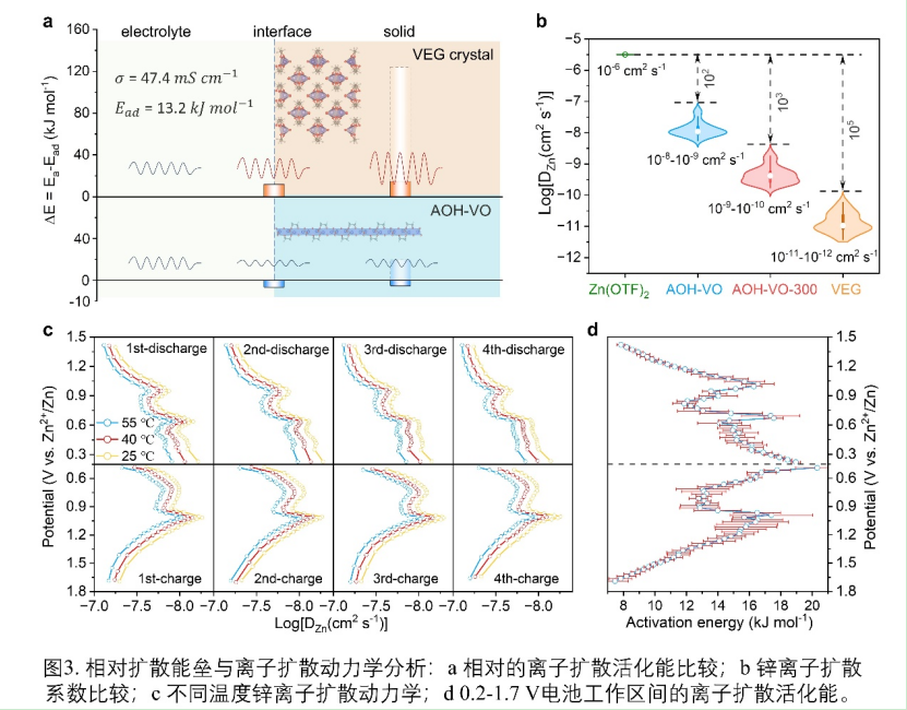 針對這一難題,研究團隊提出了“配體螯合-非晶化”協同提升釩基氧化物正極材料鋅離子遷移能力的新策略,設計制備了V4+/V5+混合價態的非晶乙二醇氧釩材料(AOH-VO)。研究表明,有機乙二醇配體螯合釩氧分子鏈形成的非晶無序結構,減弱了鋅離子與活性物質骨架的庫侖相互作用,降低了鋅離子擴散活化能。其一維有機-無機雜化分子鏈組裝形成的原子/分子級微孔,為鋅離子的快速擴散提供了有效通道,促進了鋅離子傳輸。獲得的非晶AOH-VO的初始離子擴散活化能可達7.8 ?kJ?mol?1、擴散系數達到10?8 cm2?s?1,與晶態乙二醇氧釩材料(VEG)相比,擴散活化能降低了3倍、離子擴散系數提高了3個數量級。在0.2-1.7 V電池工作區間,鋅離子固體擴散活化能達到7.8?-20.3 kJ?mol?1,與電解液體系的離子擴散活化能10.9-18.2 kJ?mol?1相當,表明與電解液相比固體中的鋅離子已接近無障礙傳輸。此外,非晶AOH-VO中乙二醇配體的螯合效應也顯著增強了釩氧骨架的穩定性,使其在100 A?g?1超高比電流密度下、17000次循環后,容量保持率仍然高達93%。
