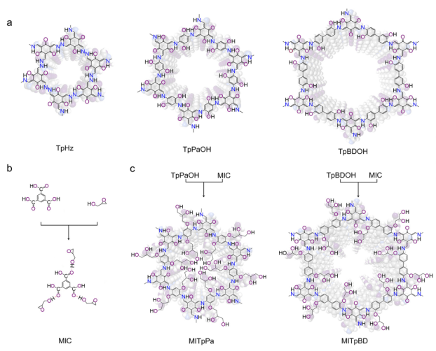 海水中含有最大的鈾資源儲量,約為45億噸,這一潛在的巨大資源有望支撐數千年的核能生產。然而,海洋中鈾的濃度極低(約3.3ppb),且與大量干擾離子共存。過去幾十年,已有多種方法被開發用于從海水中提取鈾,包括:電催化還原、光催化還原和吸附等。在這些方法中,吸附法因其操作簡單、能耗低,成為工業化提取海水中鈾的最有前景路線。然而,目前的吸附劑通過配位鍵提取鈾酰離子(UO22+),在容量、選擇性和工作時間等方面都未能達到實際應用的要求。針對上述關鍵科學問題,朱廣山教授團隊選擇了三甲酸苯作為[UO2(CO3)3]4?陰離子的模板,合成了兩種具有相同hcb拓撲結構、豐富羥基基團和不同孔徑的分子印跡多孔框架材料。在納米尺度的限制空間內,形成特異性的三碳酸鈾酰根陰離子納米通道。