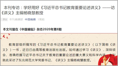 關(guān)于學(xué)習(xí)運(yùn)用好《習(xí)近平總書記教育重要論述講義》的通知 《中國編輯》雜志專訪 《習(xí)近平總書記教育重要論述講義》主編楊曉慧教授