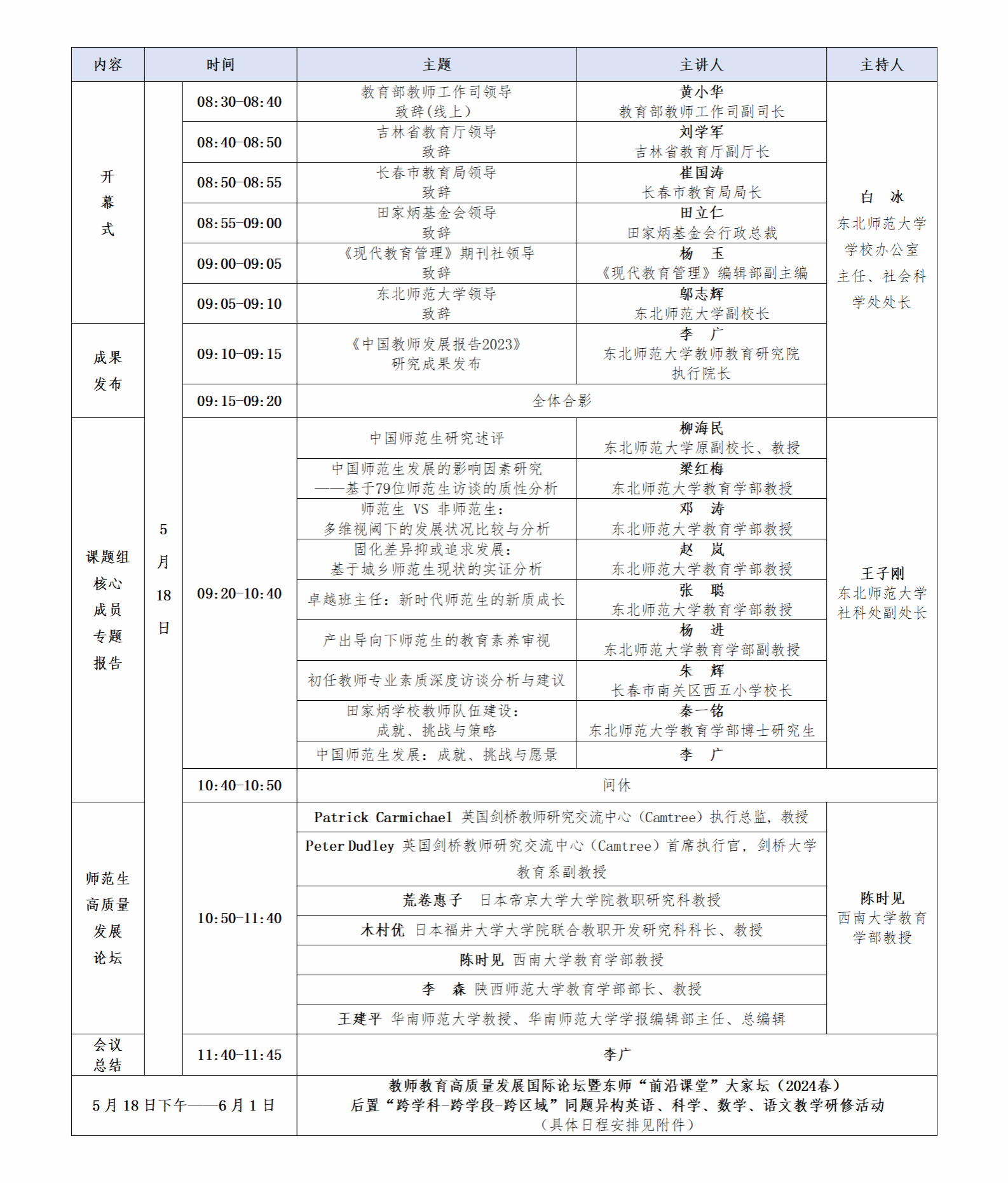 附件:1.教師教育高質量發展國際論壇暨東師“前沿課堂”大家壇(2024春)日程安排(5月18日下午—19日)
