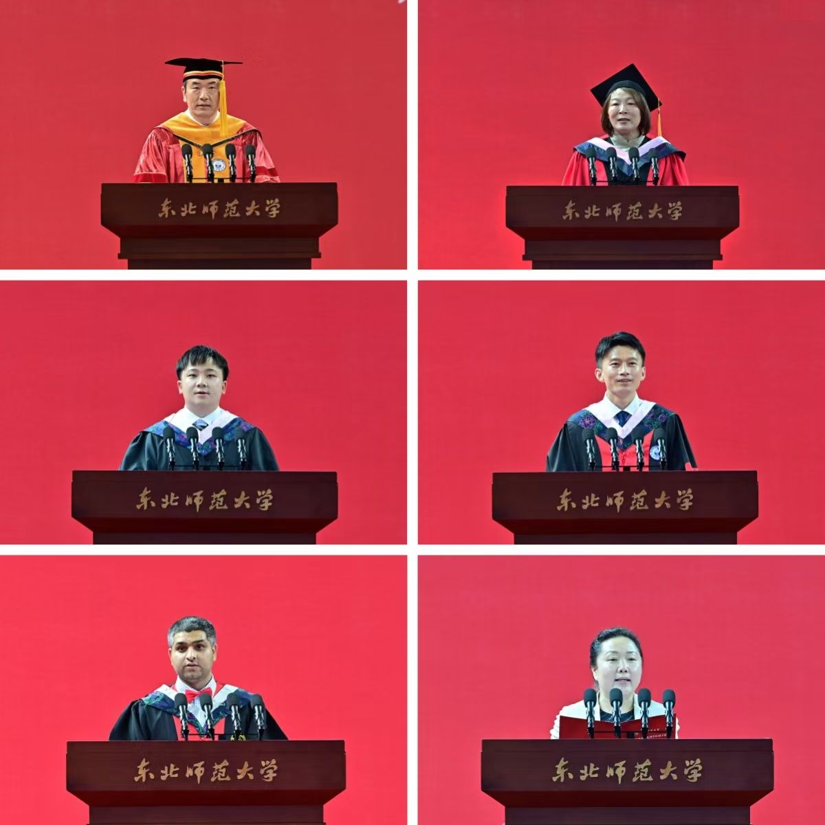 教師代表、傳媒科學(xué)學(xué)院院長(zhǎng)史冊(cè)勉勵(lì)畢業(yè)生銘記校園點(diǎn)滴鑄就的情感紐帶,傳承東師自延安烽火中淬煉的“師道之光”,在未來的道路上攜“責(zé)任、勇敢、快樂”前行,以教育報(bào)國之志續(xù)寫東師人新的傳奇。本科生代表、馬克思主義學(xué)部2025屆本科畢業(yè)生秦宇爍分享了自己從汶川考入東師,努力實(shí)現(xiàn)青春價(jià)值、探索成長(zhǎng)意義的故事,將帶著東師人的“四實(shí)品格”,在平凡的崗位上書寫不凡的篇章。研究生代表、經(jīng)濟(jì)與管理學(xué)院2025屆博士研究生谷城表示東師厚重求實(shí)、包容開放的精神沃土,滋養(yǎng)了自己為學(xué)、為事、為人的堅(jiān)實(shí)根基,立志要以躬耕者的姿態(tài),做一名扎根講臺(tái)、播撒希望的人民教師。留學(xué)生代表、巴基斯坦籍博士研究生安林代表2025屆全體畢業(yè)留學(xué)生向母校的培養(yǎng)和全體師生表達(dá)了感謝,并表示將帶著在母校積累的知識(shí),為促進(jìn)民心相通、推動(dòng)構(gòu)建人類命運(yùn)共同體貢獻(xiàn)力量。校友代表、數(shù)學(xué)系1988級(jí)本科校友、全國模范教師、哈爾濱市第三中學(xué)校長(zhǎng)王健勉勵(lì)畢業(yè)生永葆教育初心,勇立教育潮頭,堅(jiān)持終身學(xué)習(xí),將個(gè)人理想融入國家發(fā)展的宏偉藍(lán)圖,與時(shí)代發(fā)展同頻共振,做永不停歇的追光者。