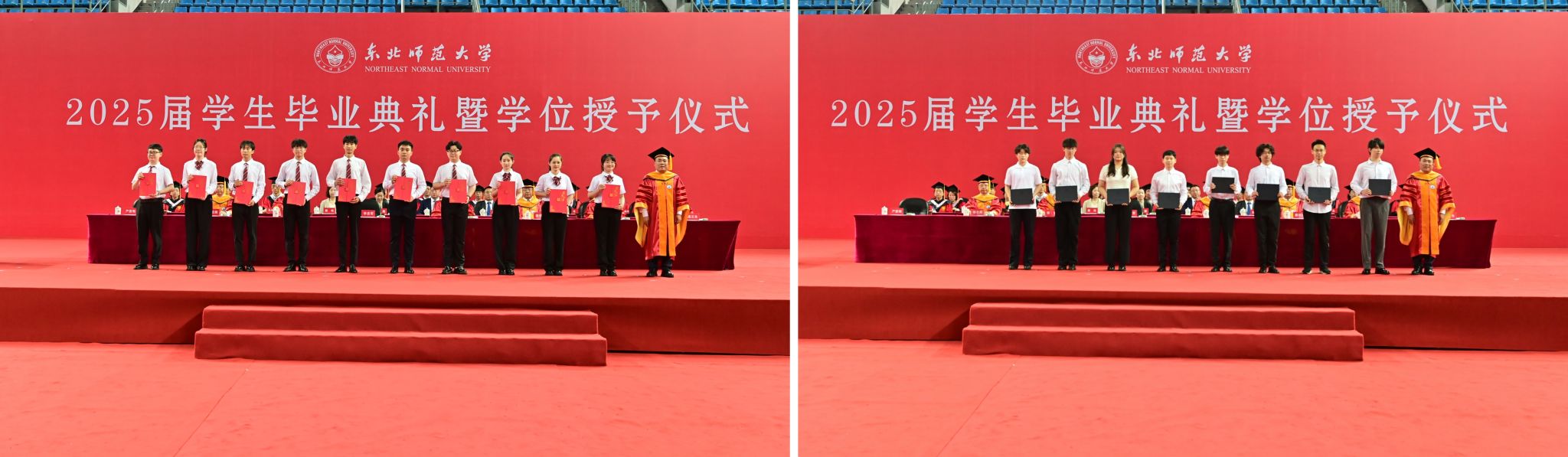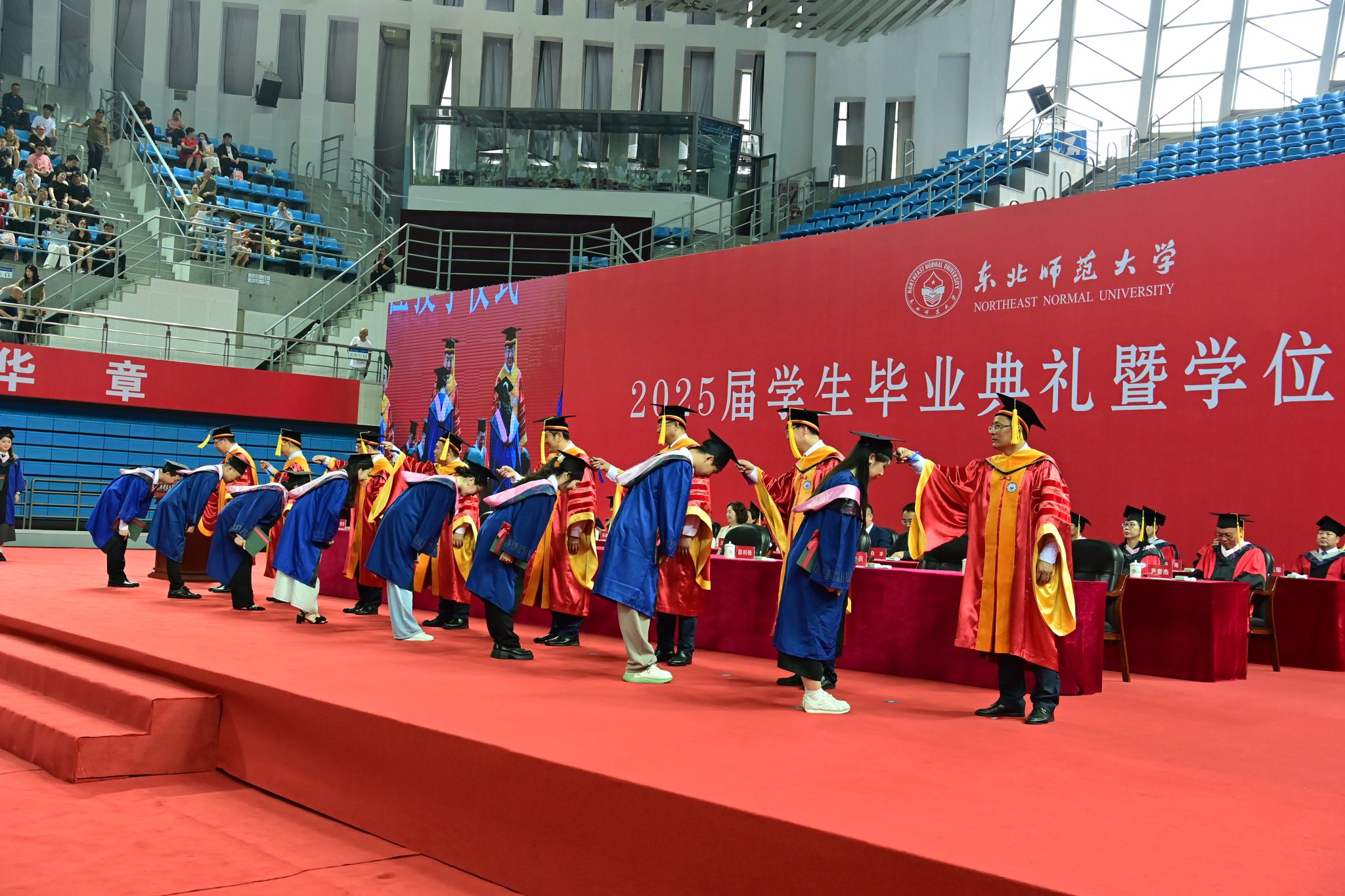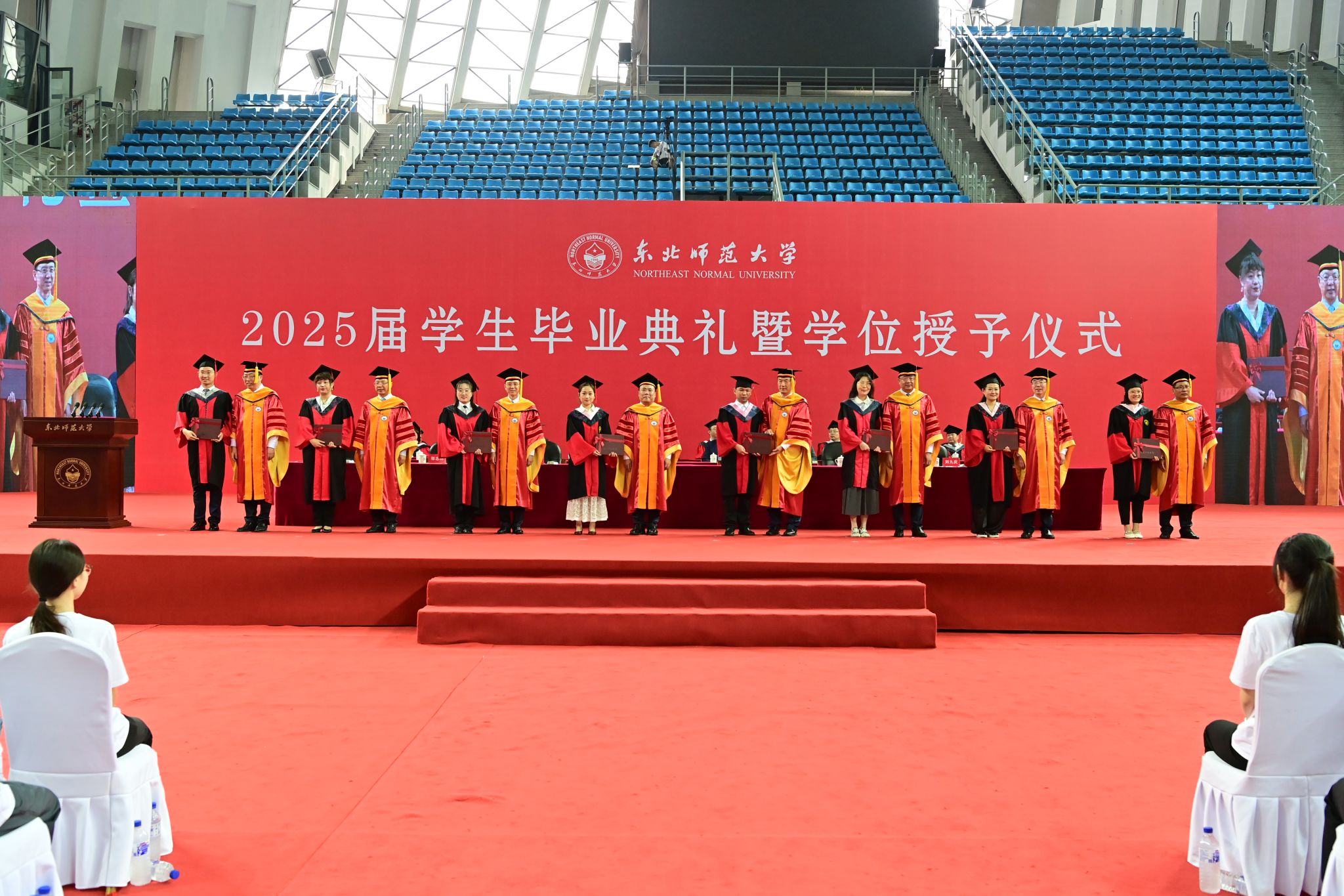 常青宣讀了東北師范大學(xué)關(guān)于2025屆本科畢業(yè)生評(píng)優(yōu)表彰的決定、關(guān)于2025屆畢業(yè)研究生評(píng)優(yōu)表彰的決定。李忠軍為學(xué)生代表頒發(fā)榮譽(yù)證書,為獲得“榮譽(yù)學(xué)位”的優(yōu)秀畢業(yè)生頒發(fā)了榮譽(yù)學(xué)位證書。鄔志輝宣讀了東北師范大學(xué)關(guān)于準(zhǔn)予2025屆本科生、碩士研究生和博士研究生畢業(yè)的決定和授予2025屆畢業(yè)生博士學(xué)位、碩士學(xué)位、學(xué)士學(xué)位的決定。李忠軍、徐海陽、常青、薛利鋒、鄔志輝、劉九慶、龐立生、嚴(yán)蔚剛為獲得博士學(xué)位、碩士學(xué)位、學(xué)士學(xué)位的2025屆畢業(yè)生代表授予學(xué)位并頒發(fā)學(xué)位證書。